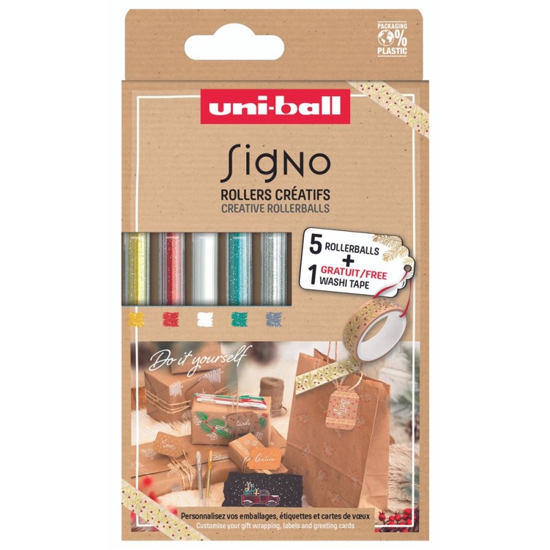Ce set comprend 5 stylos rollers Uniball Signo à encre gel et un rouleau de Washi Tape aux mtifs de Houx pour écrire, décorer et personnaliser vos cartes, étiquettes, emballages cadeaux aux couleurs de Noël.