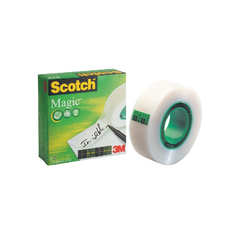 Le ruban adhésif Scotch Magic 810 de 3M est un adhésif de qualité professionnelle est à la fois invisible et permanent. Sa surface mat est inscriptible et permet des photocopies parfaites, sans ombre. Excellente résistance à la chaleur jusqu’à 150 °C. Peut-être couper à la main et ne jaunit pas dans le temps. Produit naturel à base de cellulose.