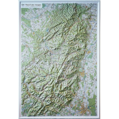 Carte murale en relief IGN pour découvrir le massif des Vosges situé dans la partie Nord-Est de la France. Echelle 1 / 100 000 (1 cm = 1 km). Échelle altimétrique 1 : 50 000 (1 cm = 500 m). Dimensions : 80 x 113 cm.