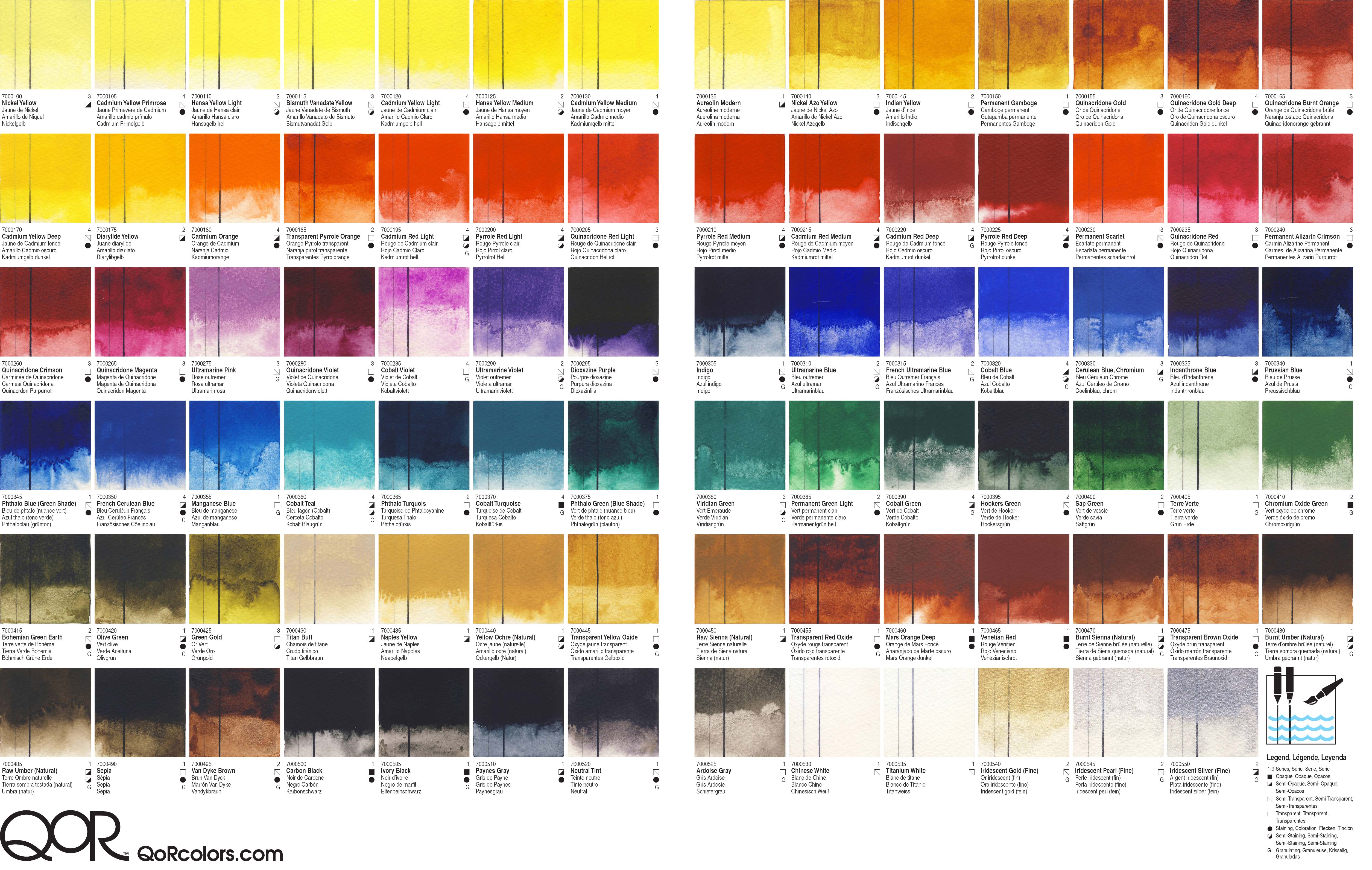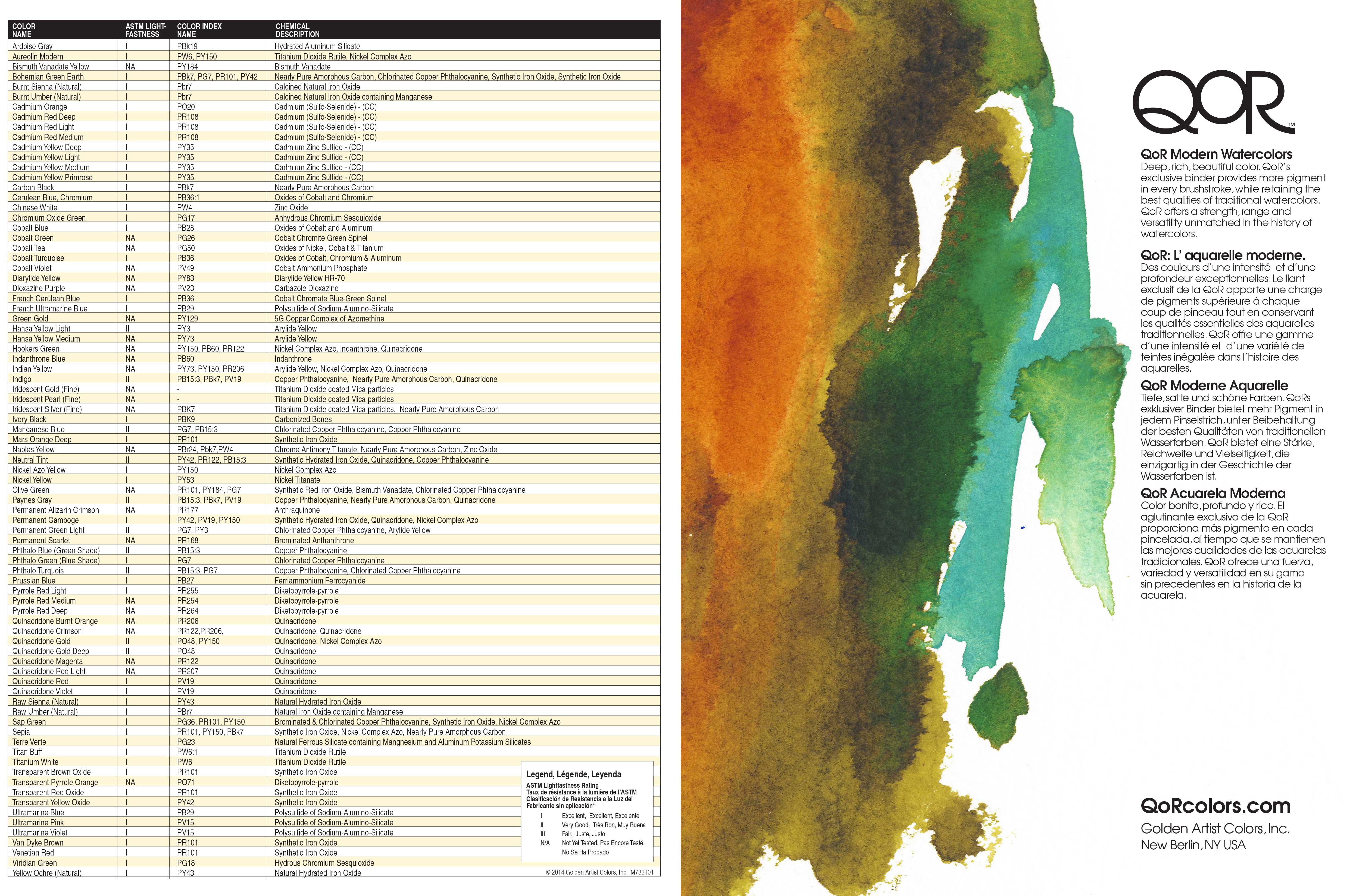 Peinture aquarelle extra-fine QoR, aquarelle extra-fine Qor Golden créée avec le même gage de quakité que les acryliques Golden dont la réputation n'est plus à faire. Une aquarelle de qualité facile d'utilisation avec un résultat incomparable dont le sérieux est retranscrit dans le nom "QoR" pour "Quality Of Result" soit Qualité de résultat. Pour parvenir à ce résultat, Golden a puisé dans son savoir-faire : - une sélection drastique des pigments utilisés en concentration maximale pour un rendu et une stabilité dans le temps unique des couleurs - un nouveau liant synthétique, l'Aquazol, plus souple et résistant que la gomme arabique qui permet des couleurs éclatantes et brillantes même après séchage - une dilution à l'eau parfaite - une utilisation sur supports aquarelles non conventionnels sans apprêt tels que la toile, le bois ou le Yupo.