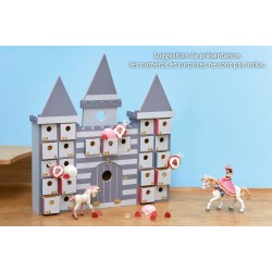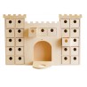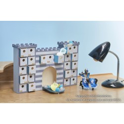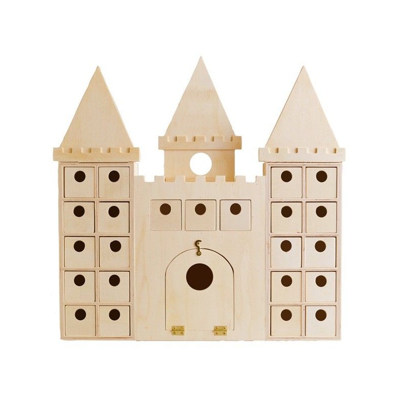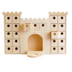 Calendrier de l'Avent en bois à décorer en forme de château fort avec tours incluses à coller si vous désirez les ajouter. Il contient 24 tiroirs à remplir de friandises et petits cadeaux en attendant Noël. Dimensions du calendrier: 34,5x47x5 cm