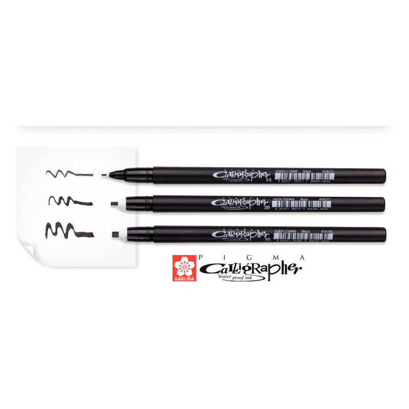 Le feutre calligraphie Pigma Cilligrapher se décline en 3 pointes plates, fine, moyenne et large pour des tracés en calligraphie, dessin et remplissage. L'encre noire pigmentée des feutres Pigma Brush Pen, de qualité archive, est indélébile, résistante à l'eau et à la lumière pour assurer la pérénnité de l'oeuvre. Taille des pointes Pigma Calligrapher : n°10 = 1 mm, n°20 = 2 mm et n°3 = 3 mm.