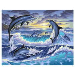 Ce kit créatif de tableau par numéros adulte Dauphins au clair de lune comprend : 1 carton toilé pré-dessiné et numéroté format 30 x 39 cm, 1 pinceau de qualité, 12 godets de peinture acrylique et 1 mode d'emploi détaillé. La peinture par numéros offre une méthode d'initiation simple à la peinture, idéale pour les débutants. Il suffit de suivre les instructions et le tour est joué.