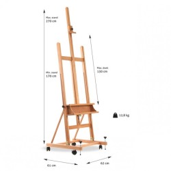 Le chevalet d'atelier Milan est fabriqué en hêtre huilé. Ce chevalet à patins monté sur roulettes possède une double tablette pour le rangement du matériel. Porte-toile extra-large de 57cm montée sur crémaillière métallique pour un réglage aisé. Superficie au sol : 61x62cm, hauteur maximale de la toile : 130cm, hauteur totale : 170 à 270cm, poids 12.8kg.