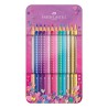 Boîtes métal contenant 12 crayons de couleurs Sparkle de Faber Castell. Crayons de couleur de qualité au manche triangulaire ergonomique et points scintillants dans une boîte au couleurs douces. Disponibles en assortiment pastel ou couleurs vives.