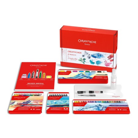 Creative Box ou Boite Créative de 9 essentiels et 3 cours en ligne - Caran d'Ache Description du contenu : 30 pastels aquarellables Neocolor II, 8 godets de gouache Studio, 10 feutres Fibralo Brush, 18 crayons de couleurs aquarellables Supracolor, 1 bloc mixed média format A4, 1 pinceau à reservoir d'eau, 1 spray, 1 sgrafitto et 3 cours Creative Class.