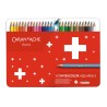 Crayons de couleur aquarellables Swisscolor de Caran d'Ache, proposés en boîtes métal de 12, 18, 30 ou 40 couleurs lumineuses. Le pigment se dilue à l'eau pour obtenir de jolis effets aquarelle au pinceau, à l'éponge et même au doigt.
