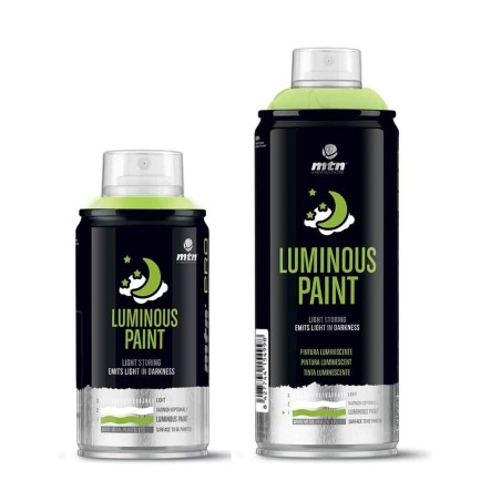 Peinture phospohorescnte Montana Pro en aéroslol de 150 ml et 400 ml. La peinture phosphorescente MTN PRO est quasiment invisible le jour et se recharge à la lumière pourbriller dans l'obscurité. Ses usages sont nombreux et infinis : graffiti, travaux artistiques, maquettes, bricolage, do-it-yourself, automobile... A base d'eau et séchage rapide.