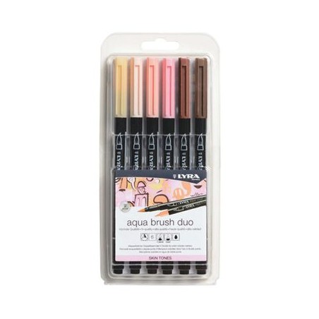 Sélection de 6 feutres-pinceaux Aqua Brush Duo de Lyra selon le thême: tons gris, primaires, pastels, ou chairs. Ce feutre possède une pointe fine pour le détail et une pointe pinceau pour les effets et larges surfaces. Encre à base d'eau sans solvant de qualité Beaux-Arts avec une excellente résistance à la lumière, les couleurs sont miscibles entre elles lorsqu'elles sont encore humides.