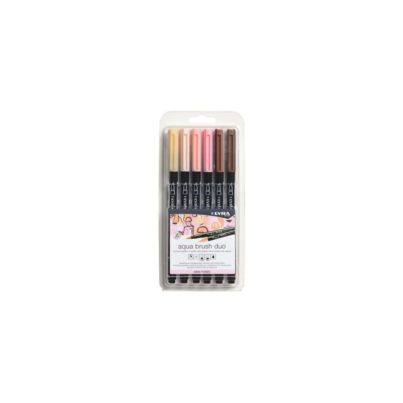 Sélection de 6 feutres-pinceaux Aqua Brush Duo de Lyra selon le thême: tons gris, primaires, pastels, ou chairs. Ce feutre possède une pointe fine pour le détail et une pointe pinceau pour les effets et larges surfaces. Encre à base d'eau sans solvant de qualité Beaux-Arts avec une excellente résistance à la lumière, les couleurs sont miscibles entre elles lorsqu'elles sont encore humides.
