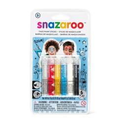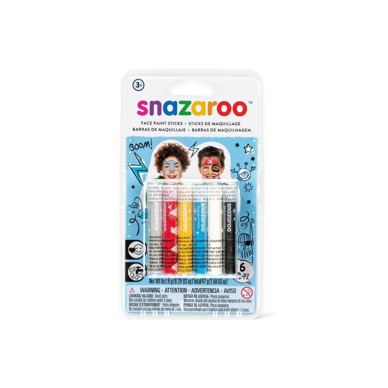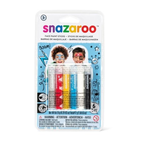 Set de sticks de maquillage pour visage Garçons contenant un assortiment de 6 couleurs. Ces sticks sont très faciles à utiliser : pas besoin d'eau pour appliquer le maquillage sur la peau. Ils permettent à la fois de maquiller de grandes surfaces et de dessiner des lignes précises. les sticks de maquillage snazaroo sont hypoallergéniques, non toxiques et s'enlèvent facilement à l'eau savonneuse.