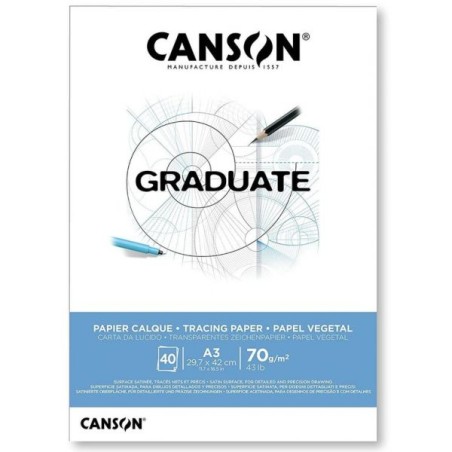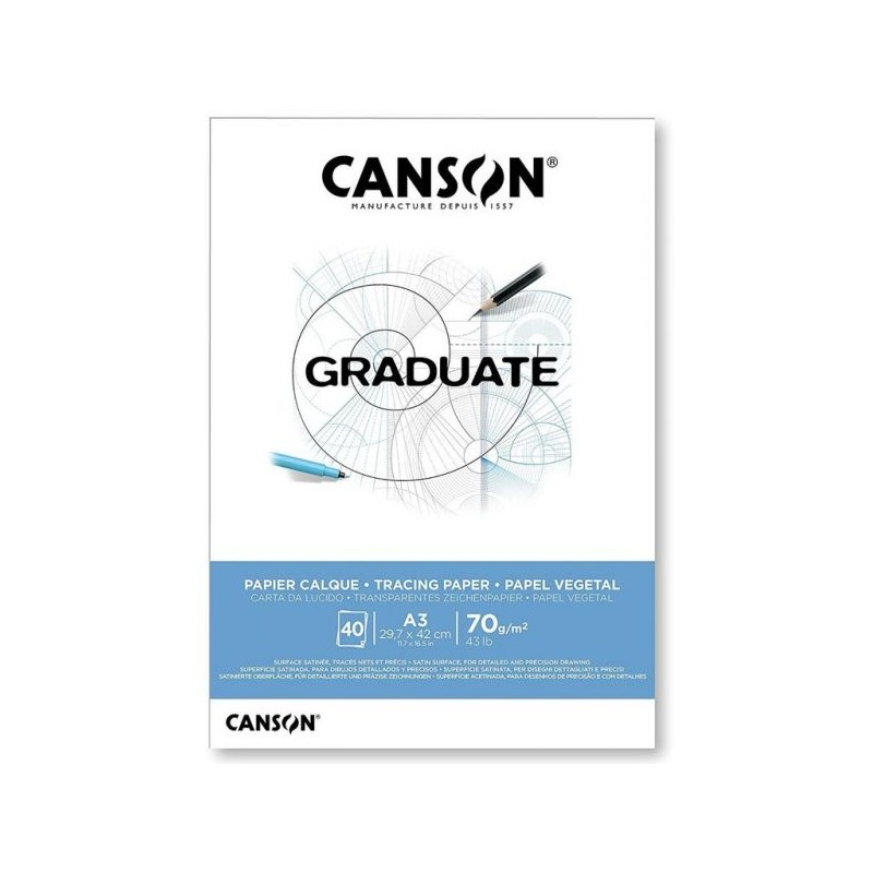 Bloc papier Graduate Calque de Canson pour l'utilisation du crayon graphite, du stylo, de la pointe tubulaire et de la plume. Il possède une bonne résistance au gommage. Les 40 feuilles que contiennent ces blocs sont collées sur un côté et se déclinent en 2 formats : A4 (21x29.7 cm) et A3 (29.7x42 cm). Fabriqué en France , certifiée FSC et garanti sans acide.