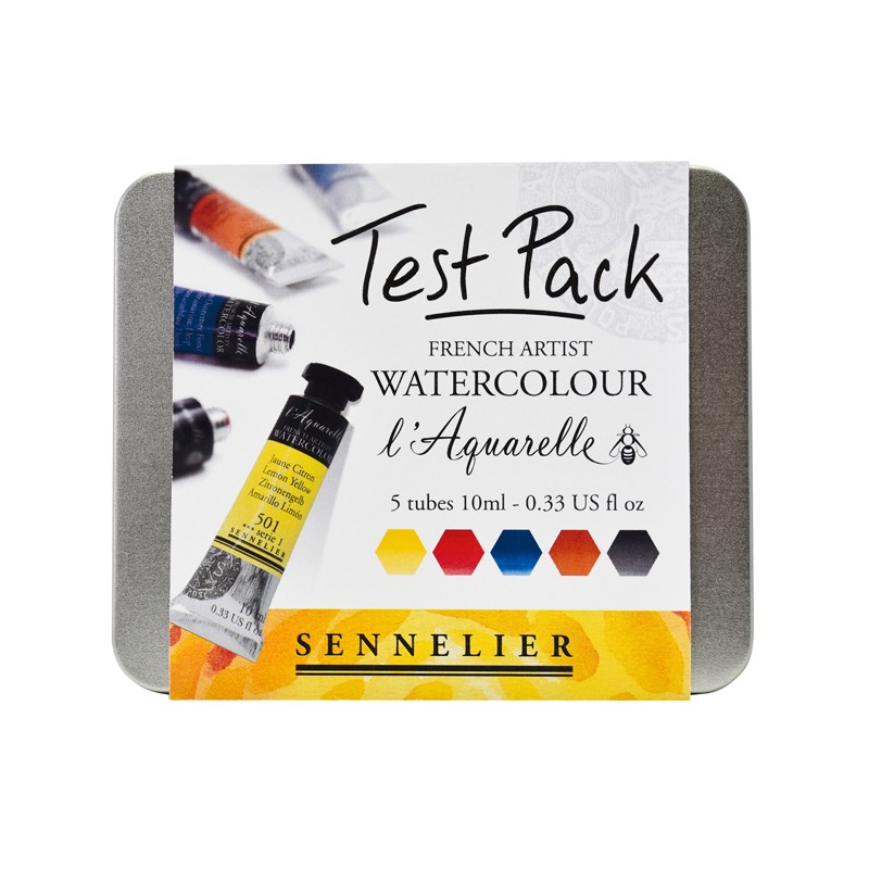 Test pack de 5 tubes 10ml d'aquarelle dans une boîte en métal pour découvrir l'aquarelle extra-fine Sennelier.