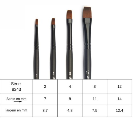 Le pinceau plat Stradivarius n°8343 est fabriqué à partir d'une fibre synthétique qui imite à la prefection le poils de martre de Kolinsky. Le pinceau Stradivarius plat est idéal pour l'execution des fonds et des aplats à l'aquarelle, à l'encre ou avec toutes techniques fluides.