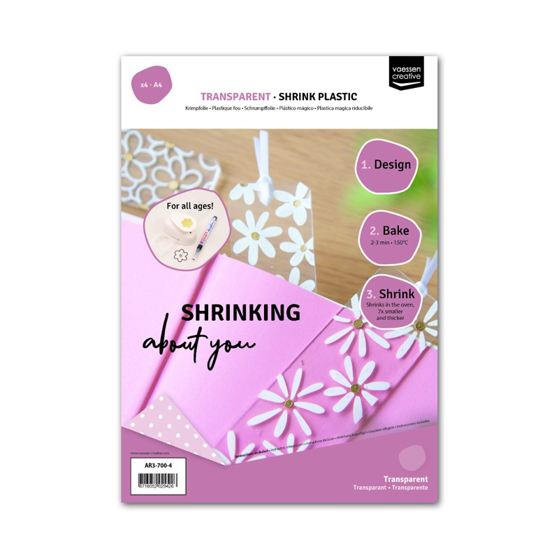 Pochettes de plastique dingue - ou plastique fou - format A4 transparent. Le plastique dingue est idéal pour fabriquer bijoux, porte-clés, magnets, etc. Dessinez dessus aux marqueurs indélébiles, découpez votre forme et passez-là au four pendant quelques minutes. La feuille de plastique va rétrécir et s'épaissir de 7 fois sa taille ! Disponible en lots de 4 ou 25 feuilles.