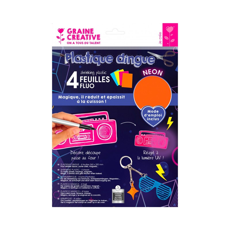 Pochette de 4 feuilles de plastique dingue - ou plastique fou - 26x20cm aux couleurs fluos. Le plastique dingue est idéal pour fabriquer bijoux, porte-clés, magnets, etc. Dessinez, découpez, puis cuisez vos motifs pour les voir rétrécir et durcir. La feuille de plastique va rétrécir et s'épaissir jusqu'à 7 fois sa taille !