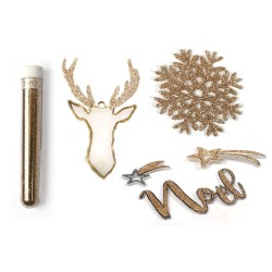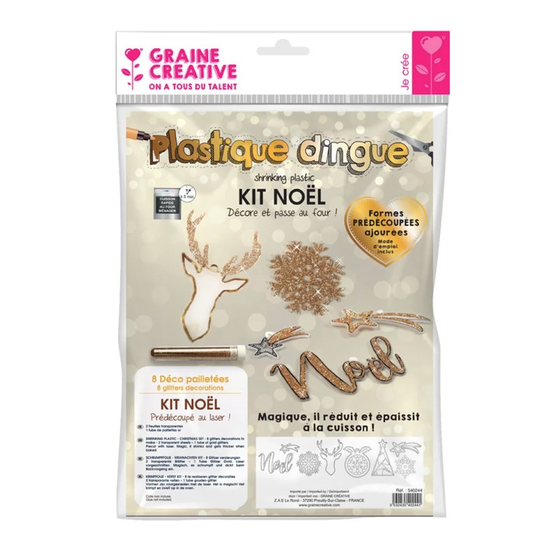Kit Plastique dingue de Noël pour créer 8 décorations pailletées avec Graine Créative. Il inclus 2 feuilles de plastique magique prédécoupées à décorer avant de passer au four pour lui donner sa forme finale, ainsi qu'un tube de paillettes couleur or qui donnera à vos créations un touche enchantée.