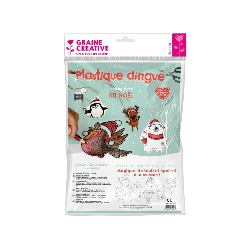 Kit Plastique dingue de Noël pour créer 7 suspensions hivernales avec Graine Créative. Il inclus 2 feuilles de plastique fou prédécoupées à décorer avant de passer au four pour lui donner sa forme finale, ainsi qu'un fil couleur or pour pouvoir les suspendre au sapin ou à la fenêtre.