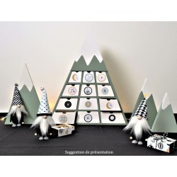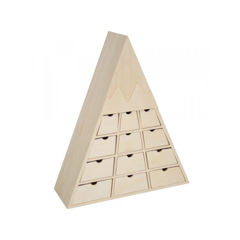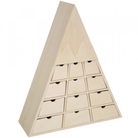 Calendrier de l'Aventen forme de montagne en bois brut à décorer composé de 24 tiroirs pour placer chocolats et surprises en attendant Noël. Reproduisez les sommets enneigés pour un univers digne des plus beaux paysages d’hiver. Dimensions : 33,8x12,5x40 cm