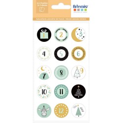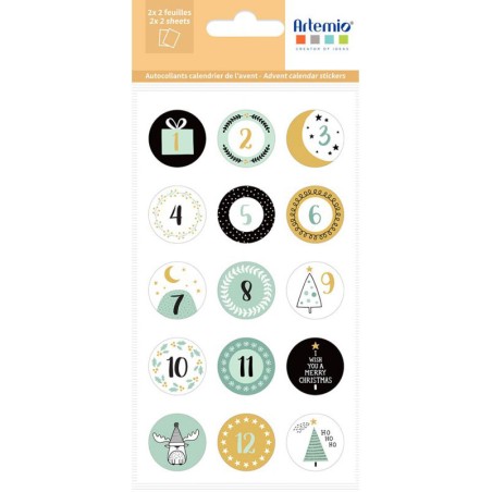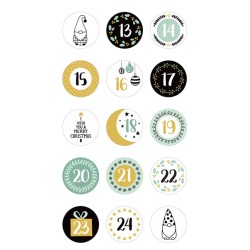 Double set de stickers ronds numérotés 1 à 24 de 2,5cm de diamètre sur le thème de Noël, série "Imagine Christmas". Idéal pour décorer vos calendriers de l'Avent.